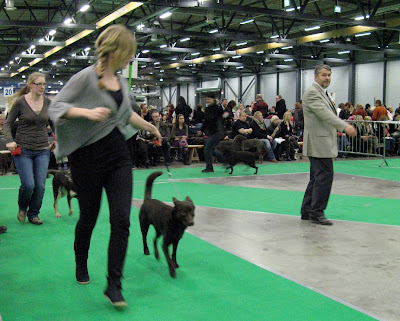 Seuraavana päivänä edellisestä oppineena tultiin paikalle jo pari tuntia ennen omaa kehää, jotta saatiin Nuuk totutettua tilanteeseen ja heti aamulla päästiin tyhjään kehäänkin treenaamaan juoksemista. Nyt Nuuk suhtautui jo paljon rauhallisemmin koko paikkaan, olihan se myös jo tuttu, ja kun meidän kehä alkoi, vein sinne tällä kertaa eilistä kengurueläintä paljon rauhallisemman koiraeläimen :) Nuuk esiintyi hienosti, seisoi jämäkästi paikallaan ja ravasi kauniisti. Sveisiläistuomari Laurent Pichardin arvostelu:
